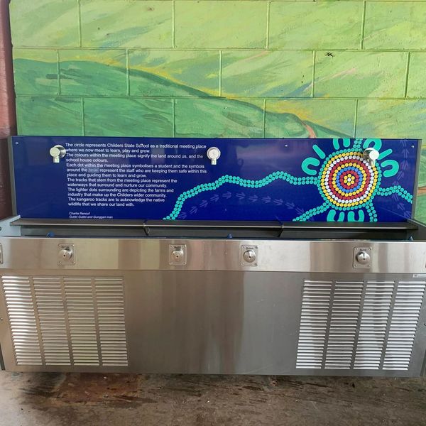 Our co-founder Charlie recently made a digital Aboriginal art piece for Childers State School to use for staff uniforms, email banners and this brand new cold water bubbler for the kids! Check out the pic for his Deadly work.